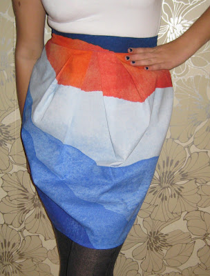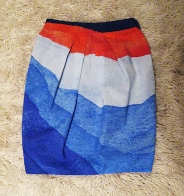 Sain vihdoin raivattua keittiön pöydälle sen verran tilaa, että mahduin ompelemaan valmiiksi jo reilu viikko sitten leikatun tulppaanihameen. Malli on erittäin nopeatekoinen ja olen itseasiassa ihan tyytyväinen lopputulokseen!Etupuolesta tuli aika paljon vaaleampi kuin mikä oli alunperin tarkoitus. Fiksu suunnittelisi ennenkuin antaa saksien laulaa… Ihan kivalta tuo kuitenkin näyttää. Pidän värityksen aaltoilevasta tunnelmasta ja kangas toimii hyvin tulppaanimallissa.