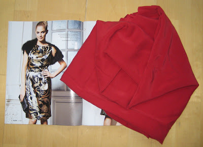 Hiekkapestystä silkistä (muistaakseni tuon tyyppistä pintakäsittelyä kutsuttiin sillä nimellä…) voisi tulla kiva kevyesti laskosteltu mekko – ainakin kankaani muistuttaa olemukseltaan hiukan lehdessä toteutettua versiota. Toisaalta lopputulos saattaa olla liian yöpukumainen.