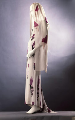 Kuva: Schiaparellin vuonna 1937 suunnittelema, Dalín kuviontiin perustuva raa’an kaunis iltapuku ja huntu “Tear”.