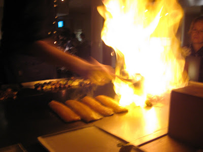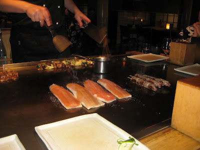 Tiesin etukäteen, että ravintolassa kaikki ovat yukatoihin pukeutuneena, mutta kokemus oli erittäin hauska ja yllättävän erikoinen siitä huolimatta. Tiesin myös, että pääruoan kokki valmistaa silmiemme edessä pöydän yhteydessä olevalla paistolevyllä. Jotenkin ajatus siitä, että illallinen paistetaan silmiemme (ja neniemme) edessä ei tuntunut mitenkään hurjan houkuttelevalta.Jouduin kuitenkin pyörtämään epäileväiset ennakkoajatukseni täysin. Uskomattoman taitava Teppanyaki-kokkimme käsitteli raaka-aineita ja välineitään vangitsevan taidokkaasti. Hänen käsiensä työskentelyn katseleminen aiheutti melkein hypnoottisen olotilan, liikkeet olivat kuin tanssia. Ja samalla hän jutusteli iloisesti hurmaavan nöyrään ja charmikkaaseen tyyliin japanilaisesta ruuasta, kulttuurista ja omasta työstään teppanyaki-kokkina.